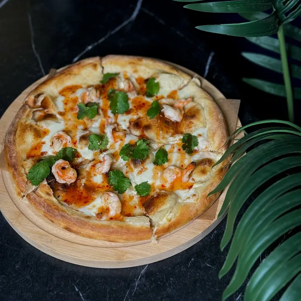 Креветки, помидоры, моцарелла, кинза, чили-сладкий соус