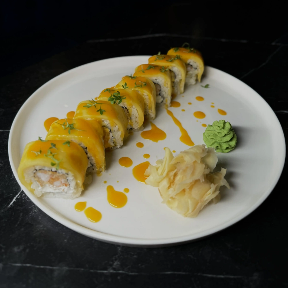Творожный сыр, манго, креветка, пюре манго